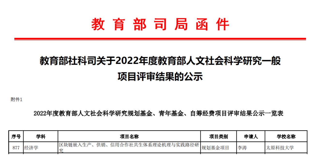 7月29日,教育部社科司公布了2022年度教育部人文社会科学研究一般项目评审结果,我院李涛副教授主持的课题《区块链嵌入生产、供销、信用合作社共生体系理论机理与实践路径研究》成功立项规划基金项目。经济学学科规划基金项目立项总数全国仅96项。