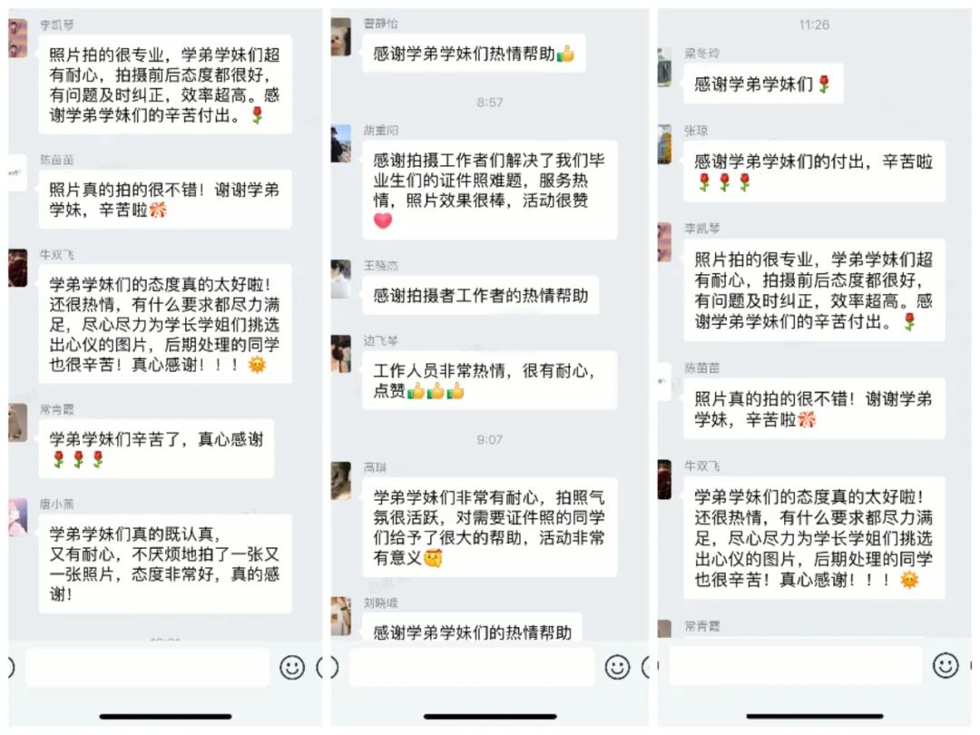 本次活动举办时正值同学们考研网上报名阶段和求职重要时期,很多同学表示,面对校园疫情防控,研究生学院和2138CC太阳集团提供拍摄服务有效地降低了外出的风险,切实解决了同学们的实际问题,很贴心也很及时。“此次活动对我们大四学生真的是雪中送炭,给我们拍摄的同学也非常的热情,照片效果也很好,很赞!”市场营销191602班的张国蕊近期急需一张符合要求的证件照,抱着试一试的态度,预约了此次摄影活动,拿到成品时特别满意。经济191601班唐小燕在拿到证件照后,也开心地说到:“清晰精美的证件照可以为简历等增色不少,拍摄的同学既认真,又有耐心,不厌烦地拍了一张又一张照片,态度非常好,真的感谢!”