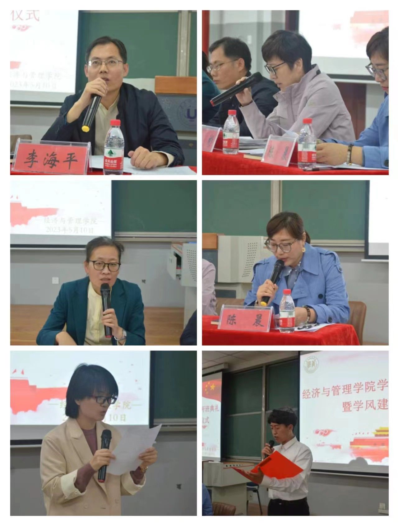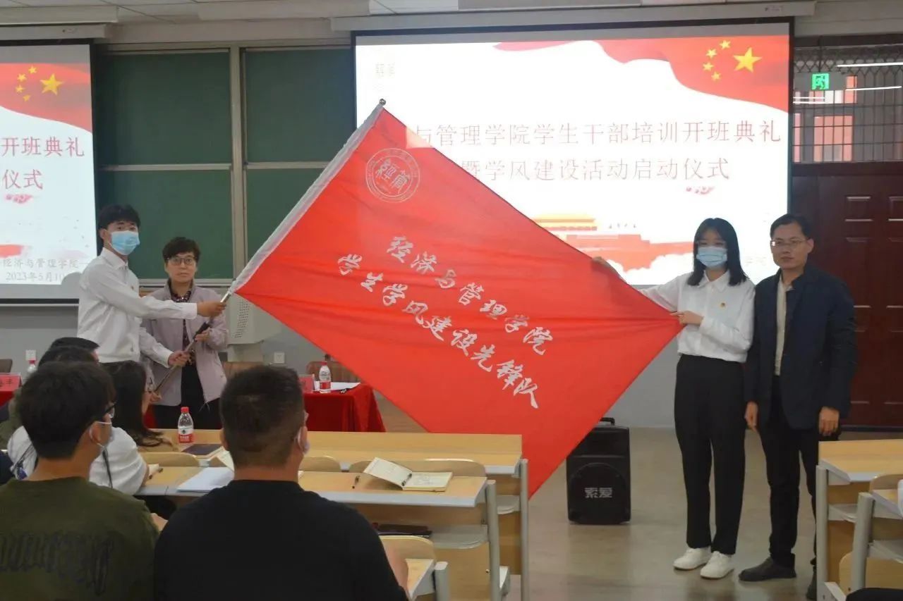 班主任代表张国凤围绕建立班级优良学风、做好班级日常管理等内容进行发言。学生骨干代表梁佳乐宣读优秀学风建设倡议书。李海平和乔彬共同为“学院学风建设先锋队”进行了授旗。