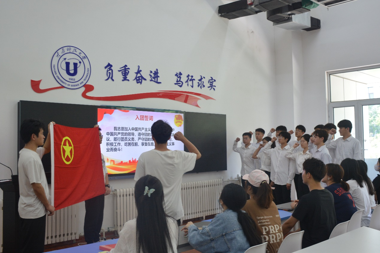 入团仪式在庄严肃穆的中华人民共和国国歌声中拉开序幕。会上,优秀学生代表梁佳乐带领新团员庄严宣誓,学院团委书记陈晨与优秀团员代表为新团员佩戴团徽。共12名同学通过本次仪式正式加入了共青团组织。