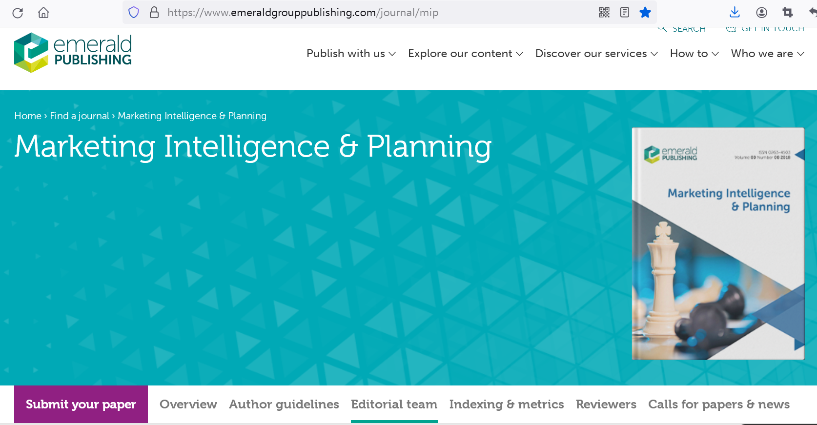 MIP是Emerald出版社旗下战略营销领域的国际知名学术期刊,主要刊发与战略市场、营销决策和营销伦理等议题相关的最新理论、述评、实证和案例研究成果。JCR203数据显示,MIP最新影响因子为4.4,学科排名为:88/154(BUSINESS),属JCR-Q3和中科院三区序列。当前刊物Editor编委会由1名主编(Editor-in-Chief)、7名资深副主编(Senior Associate Editors)、12名副主编(Associate Editors)组成。
