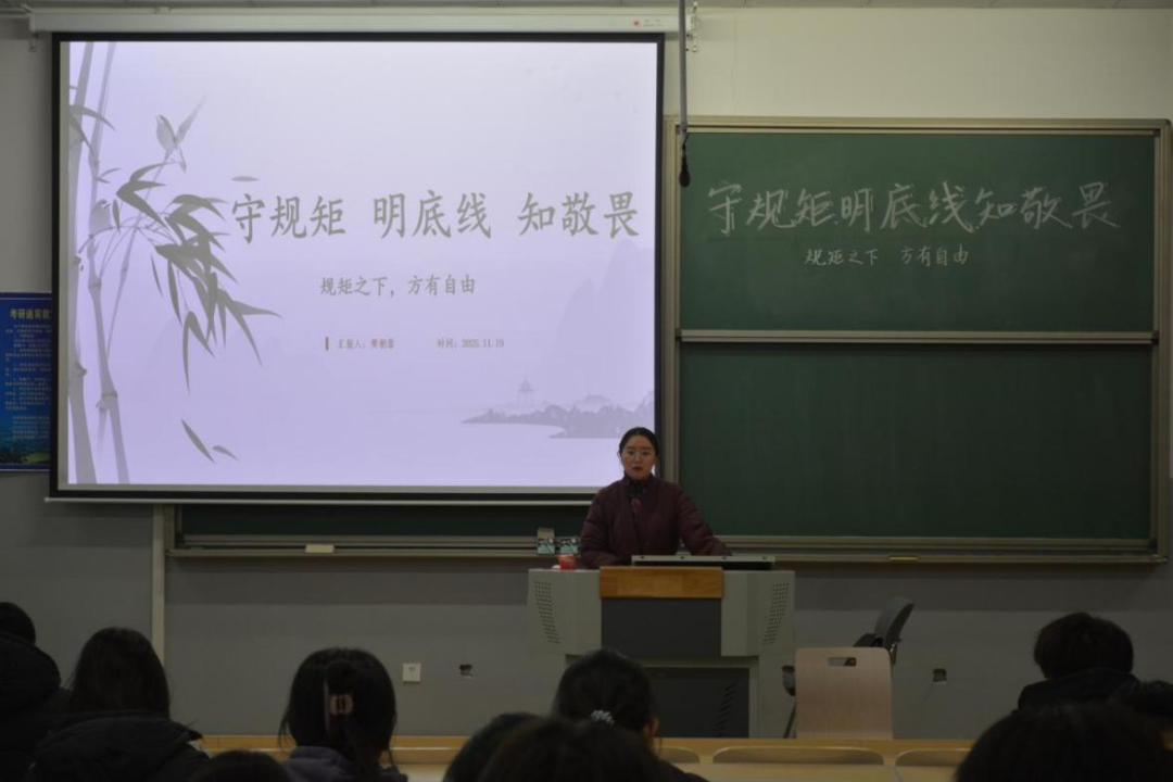 樊朝蕾结合近年来高校学生违纪典型案例,深入剖析了考试作弊、学术不端、宿舍违规用电及网络不当言行等违纪行为的严重后果,警示同学们要严守校规校纪,增强法治意识与自律能力。她强调,纪律是底线,规矩是红线,要从典型案例中汲取教训,知敬畏、存戒惧、守住底线,自觉抵制各种诱惑,做到心有所畏、言有所戒、行有所止。