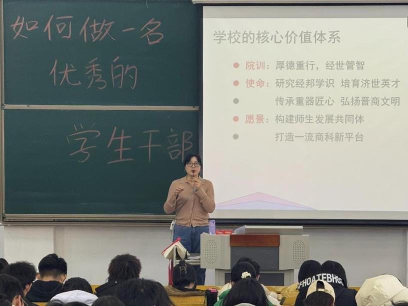 张艳霞围绕学生干部的角色定位与心理调适为核心展开深入讲解,明确了“先学后干、以干促学”的成长逻辑,梳理从认知校准到能力打磨的成长路径。通过真实案例分享,她鼓励大家正视挫折,在服务中实现自我价值的提升与心灵的成长。唯有内心坚定、素质全面,才能真正发挥桥梁纽带作用,带动集体共同进步。