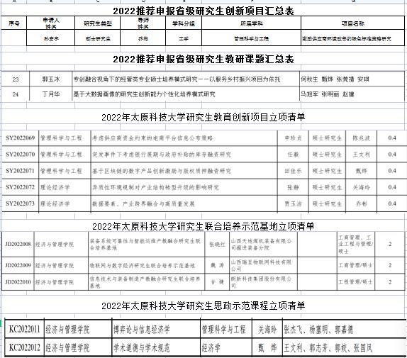学院近几年来高度重视研究生创新训练与实践工作,特别是2022年加强了对申报工作的指导,向研究生院推送各类项目16项,经学校专家遴选、审核,我院郭玉冰等两位老师获批山西省研究生教研项目;管理科学与工程研究生孙宏宇获批山西省研究生创新项目;关海玲等两位老师获批校研究生思政示范课程建设项目;张晓红等三位老师获批校产教融合研究生联合培养示范基地建设项目;申珍贞等五位同学获批校级研究生教育创新项目。立项名单如下: