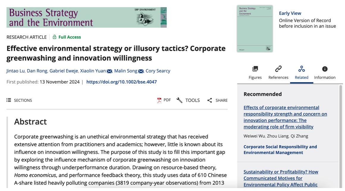 近日,我校企业社会责任中心课题团队在企业漂绿和技术创新领域取得重要进展,相关工作以“Effective environmental strategy or illusory tactics? Corporate greenwashing and innovation willingness”为题(https://onlinelibrary-wiley-com-s.webvpn.tyust.edu.cn/doi/full/10.1002/bse.4047),在线发表于管理学权威期刊Business Strategy and the Environment(ABS三星期刊,中科院一区TOP,IF12.5)。我校为第一作者单位,鲁锦涛教授为第一作者。该工作得到教育部人文社会科学研究规划基金项目、山西省政府重大决策咨询课题和山西省科技战略研究专项支持。